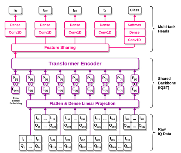 多任务学习器(MTL)框架用于解决雷达信号特征描述(RSC)这一联合优化问题。所提出的 IQST 与其他架构一样,可同时优化分类和回归任务。这将有助于从 IQ 数据中提取特征,尤其是在信噪比(SNR)较低的情况下。